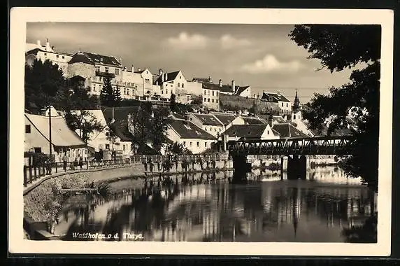 AK Waidhofen a. d. Thaya, Ortspanorama mit Brücke vom Wasser aus