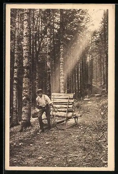 AK Waldarbeiter zieht einen Karren mit Holz, Forstwirtschaft