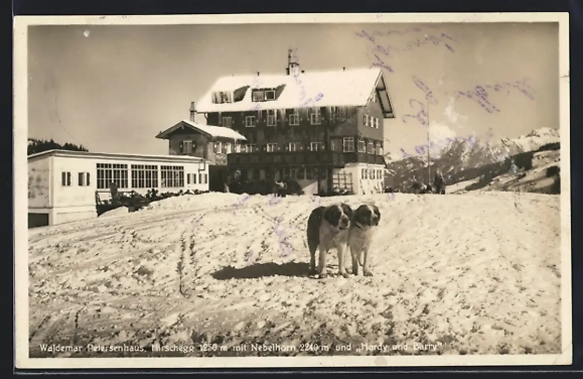 AK Waldemar Petersenhaus mit Bernhardiner Hardy u. Barty