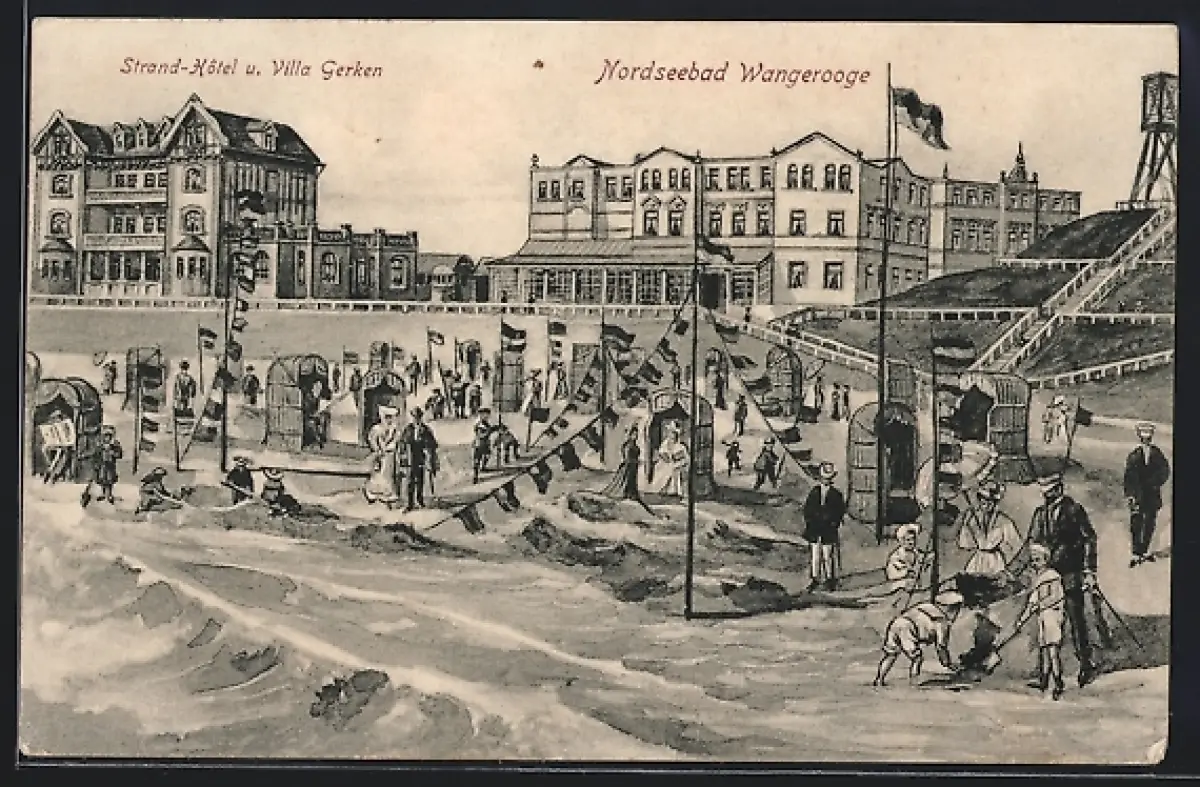 AK Wangerooge, Strandszene mit Strand-Hotel und Villa Gerken