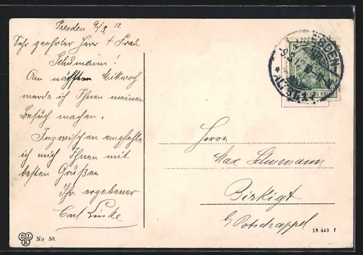 alte Ansichtskarte, gelaufen 1912, Eckknick oben li., Stempelspur, guter Zustand