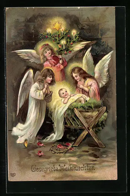 AK Weihnachtsengel mit Jesuskind in der Krippe
