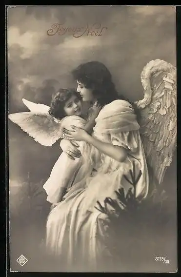 AK Weihnachtsengel mit kleinem Engel auf dem Schoss, Joyeux Noel