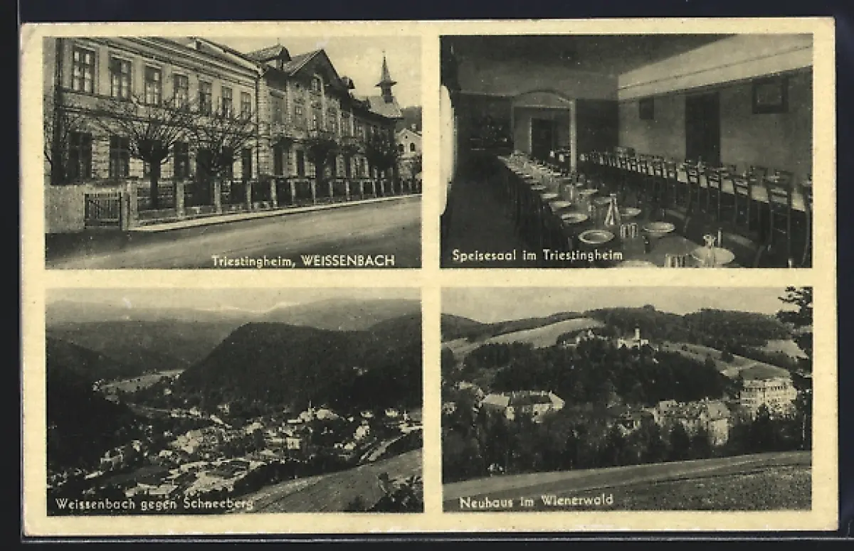 AK Weissenbach /Triesting, Triestingheim, Speisesaal, Panorama gegen Schneeberg, Neuhaus