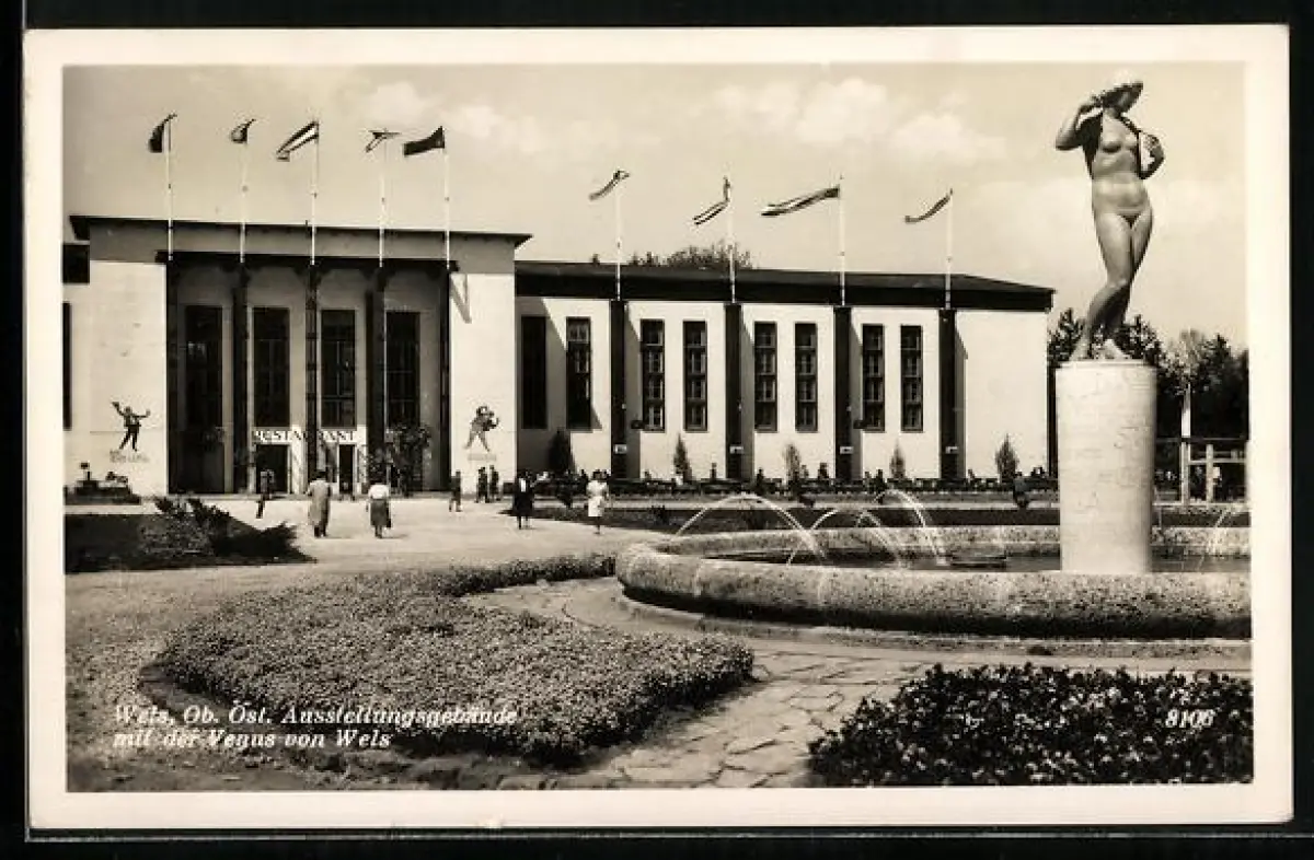 AK Wels /Ob. Öst., Ausstellungsgebäude mit der Venus von Wels