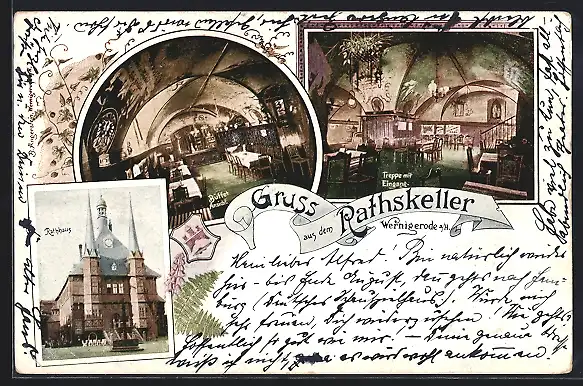 AK Wernigerode a. H., Gasthaus Ratskeller im Rathaus, Innenansichten Buffet und Treppe mit Eingang