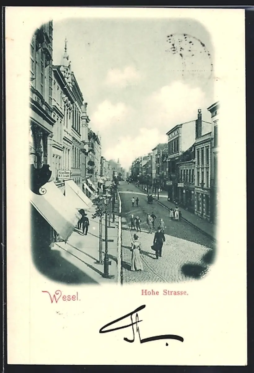 AK Wesel / Rhein, Hohe Strasse mit Militair-Effecten-Geschäft H. J. Arndt, Rückseitig: Schützenhaus