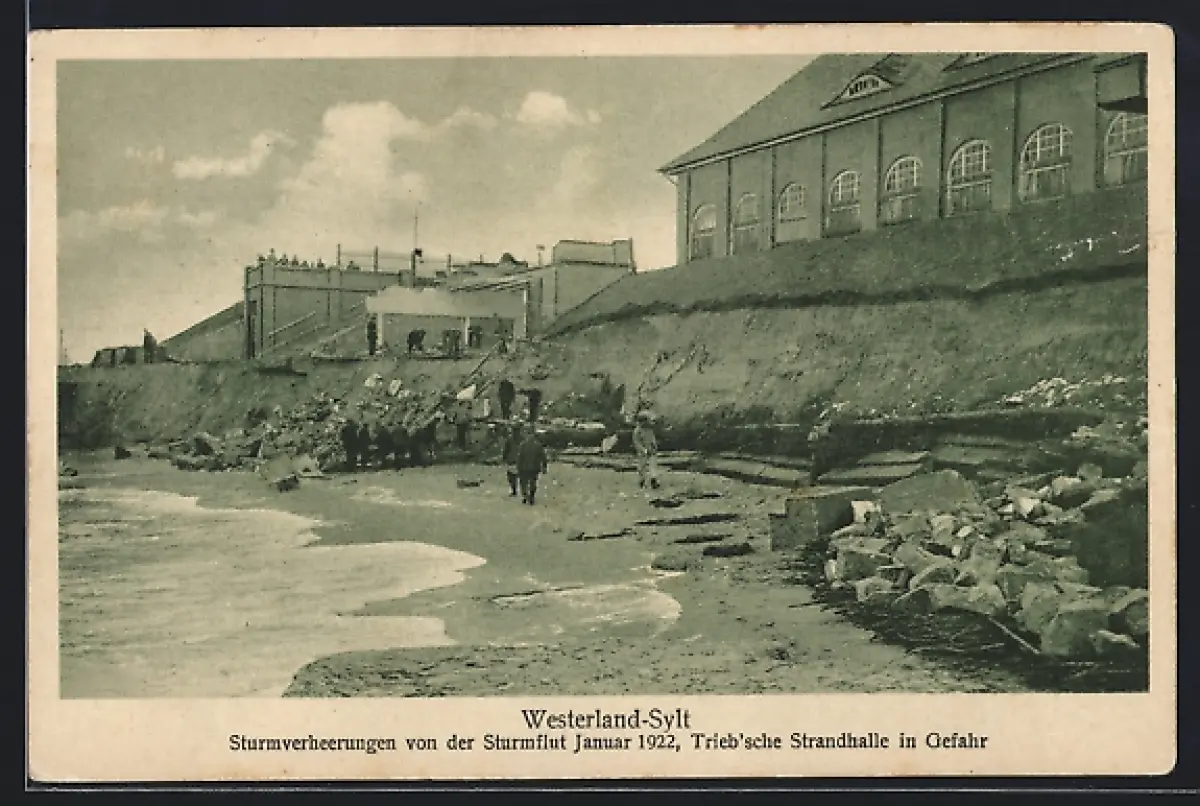 AK Westerland-Sylt, Sturmverheerungen von der Sturmflut 1922, Trieb`sche Strandhalle in Gefahr