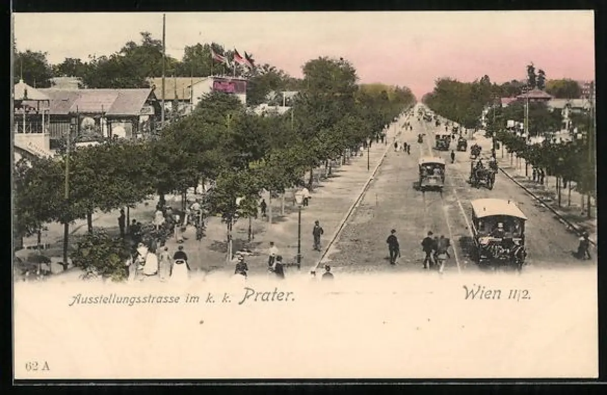 AK Wien, Ausstellungsstrasse im k. k. Prater mit Strassenbahn