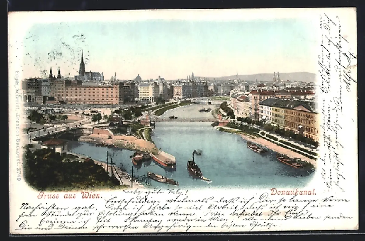AK Wien, Donaukanal mit Brücke u. Stadtpanorama aus der Vogelschau