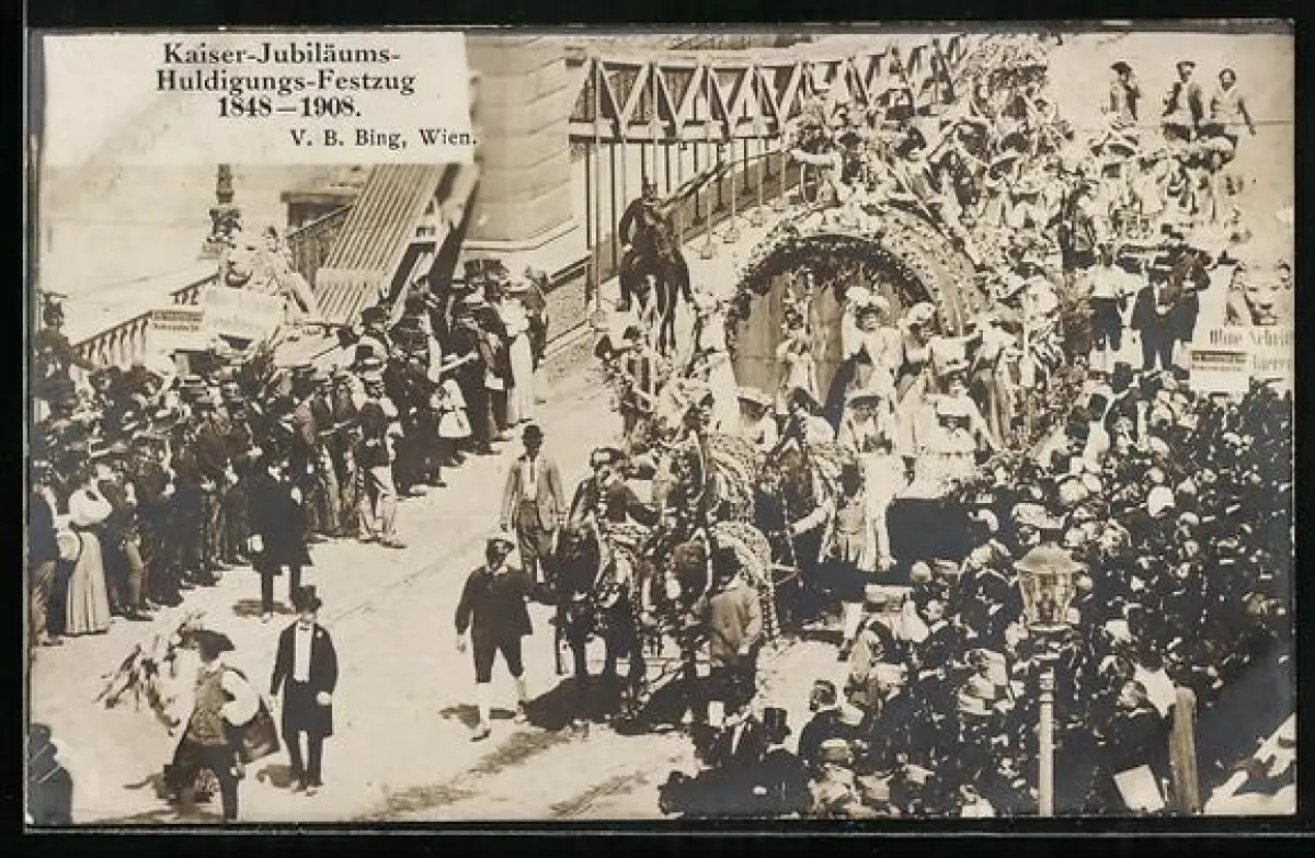 AK Wien, Kaiser-Jubiläum 1908, Huldigungs-Festzug, Wagen auf einer Brücke