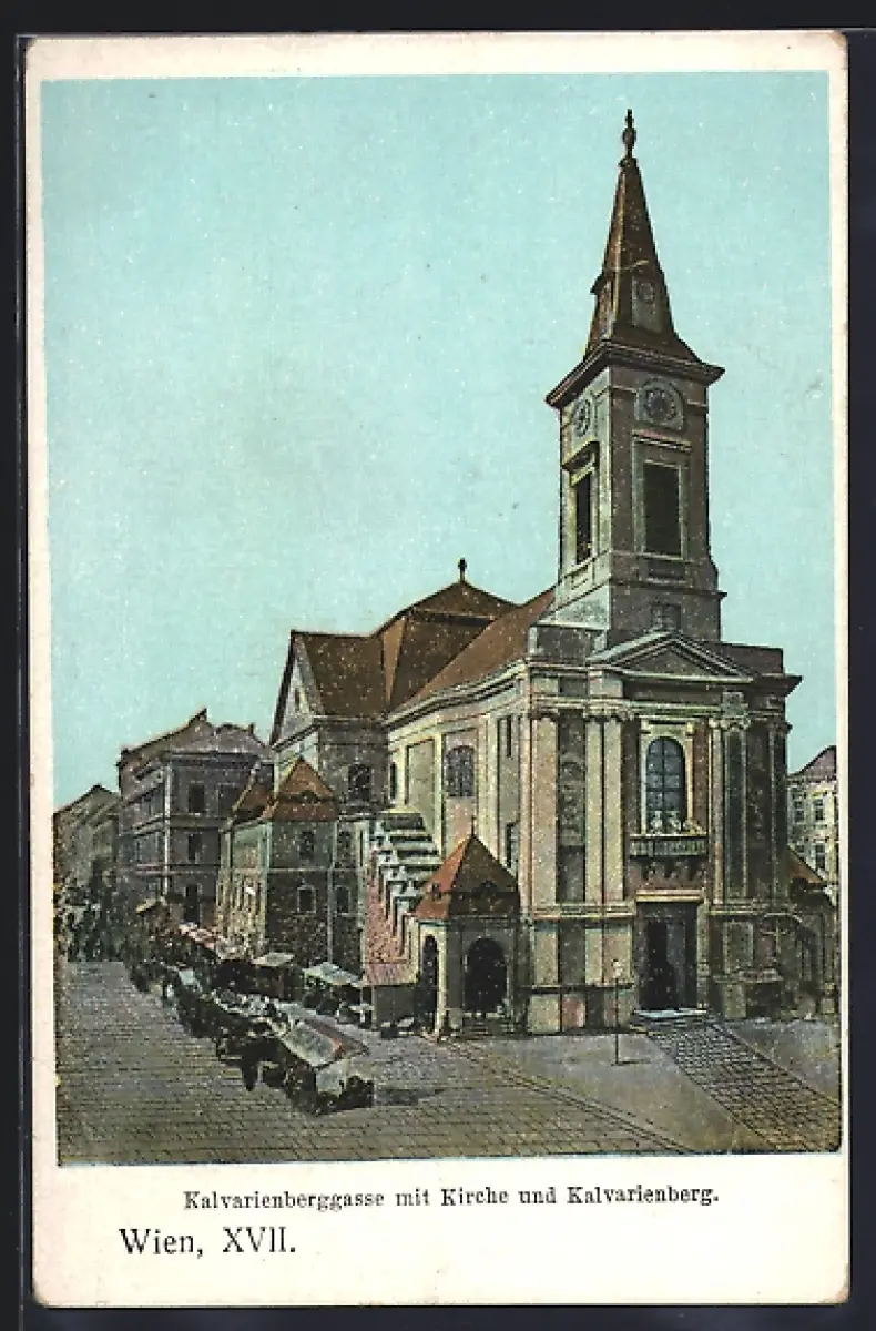 AK Wien, Kalvarienberggasse mit Kirche u. Kalvarienberg, Marktstände