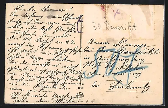Personenbezogene Daten auf der Rückseite der Karte wurden durch blauen Textmarker unkenntlich gemacht. Die blauen Stellen sind auf die Vorderseite durchgeweicht und wirken sich negativ auf das Postkartenfoto aus