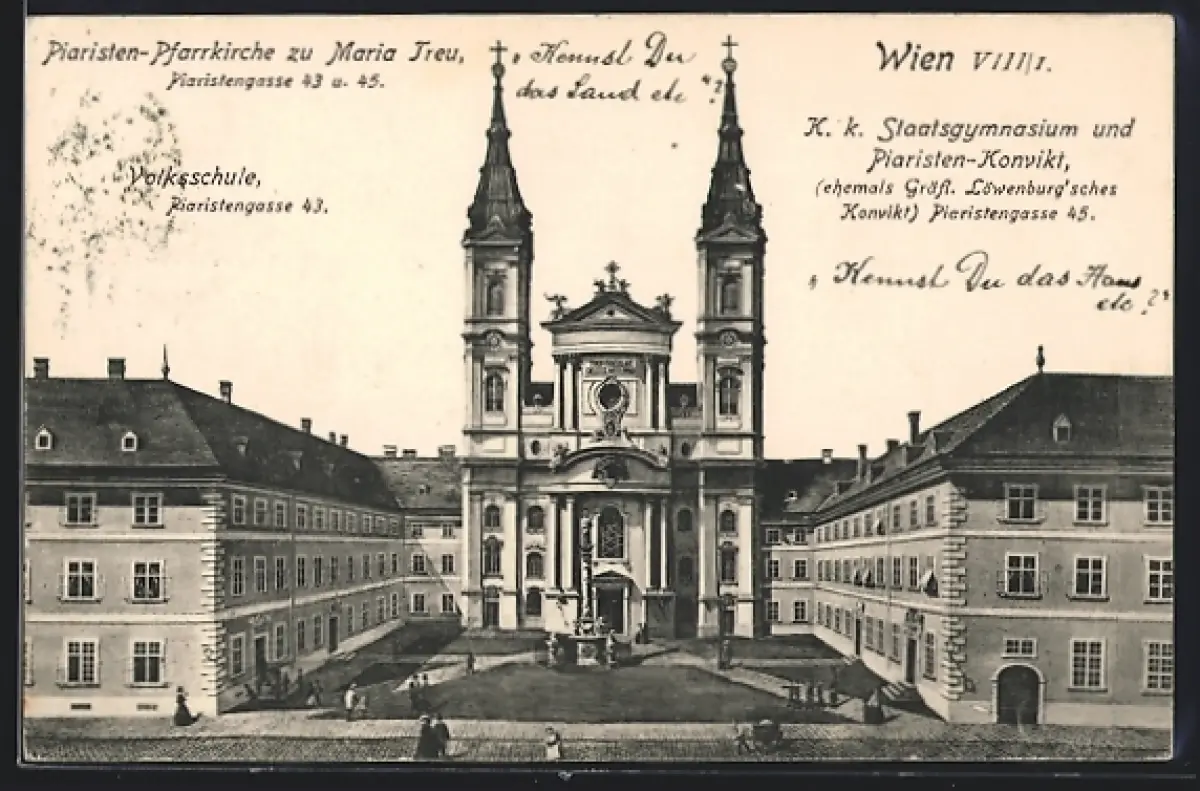 AK Wien, Piaristen-Pfarrkirche zu Maria Treu, Piaristengasse 43 u. 45, Volksschule, Piaristengasse 43
