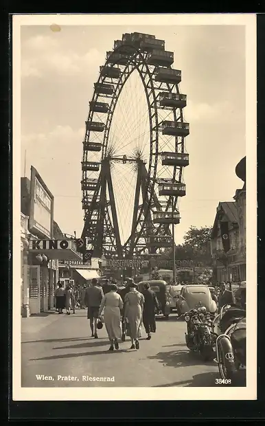 AK Wien, Prater, Riesenrad, Partie vor dem Praterkino und der Hochschaubahn