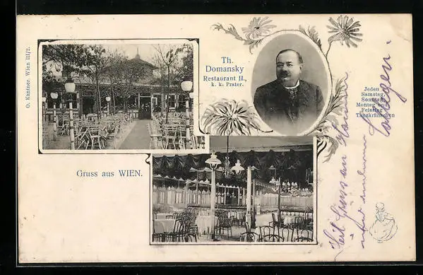 AK Wien, Restaurant v. T. Domansky mit Gartenlokal im Wiener Prater, Aussen- u. Innenansicht, Porträt