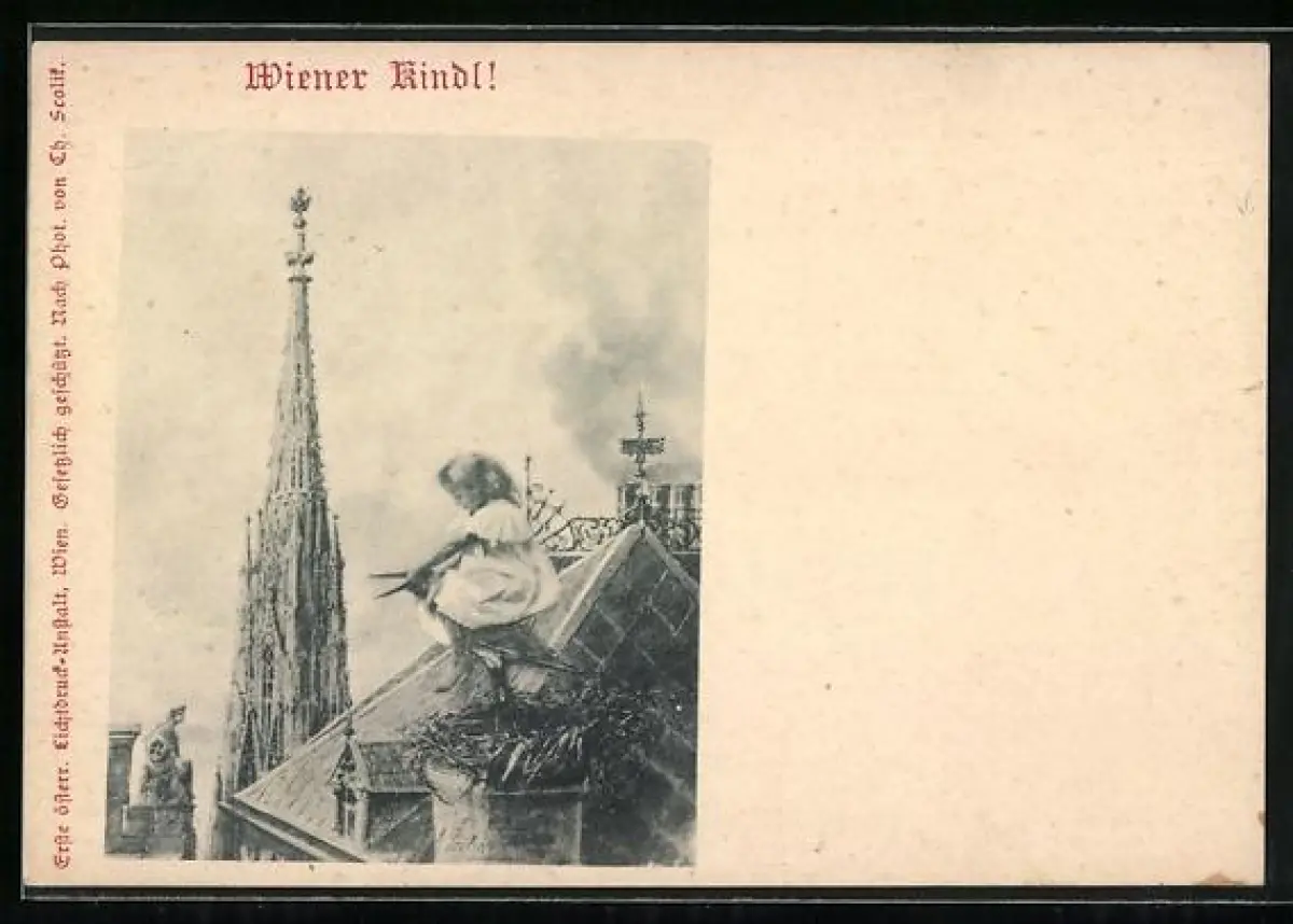 AK Wien, Wiener Kindl reitet auf einem Storch, Stefansdom