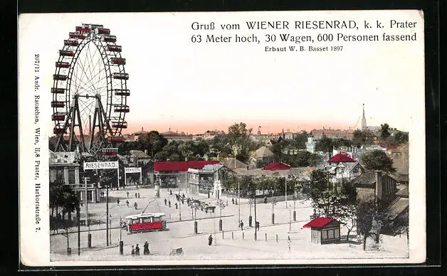 AK Wien, Wiener Riesenrad im k. k. Prater mit Strassenbahn