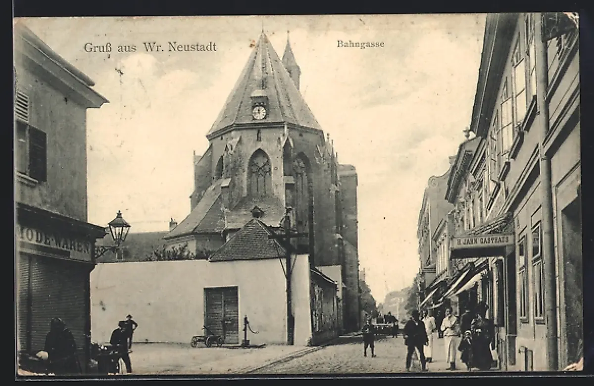 AK Wiener Neustadt, Bahngasse mit Gasthaus von H. Jahn und Kirche