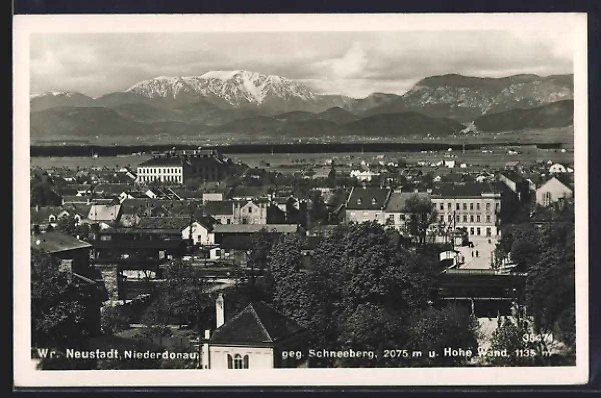 AK Wiener Neustadt, Ortspanorama mit Schneeberg und Hohe Wand