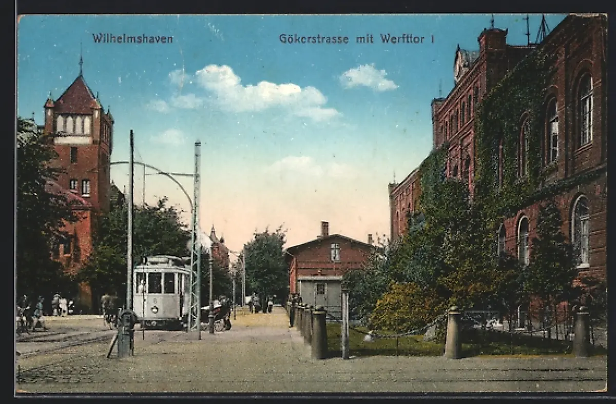 AK Wilhelmshaven, Gökerstrasse mit Werfttor 1, Strassenbahn