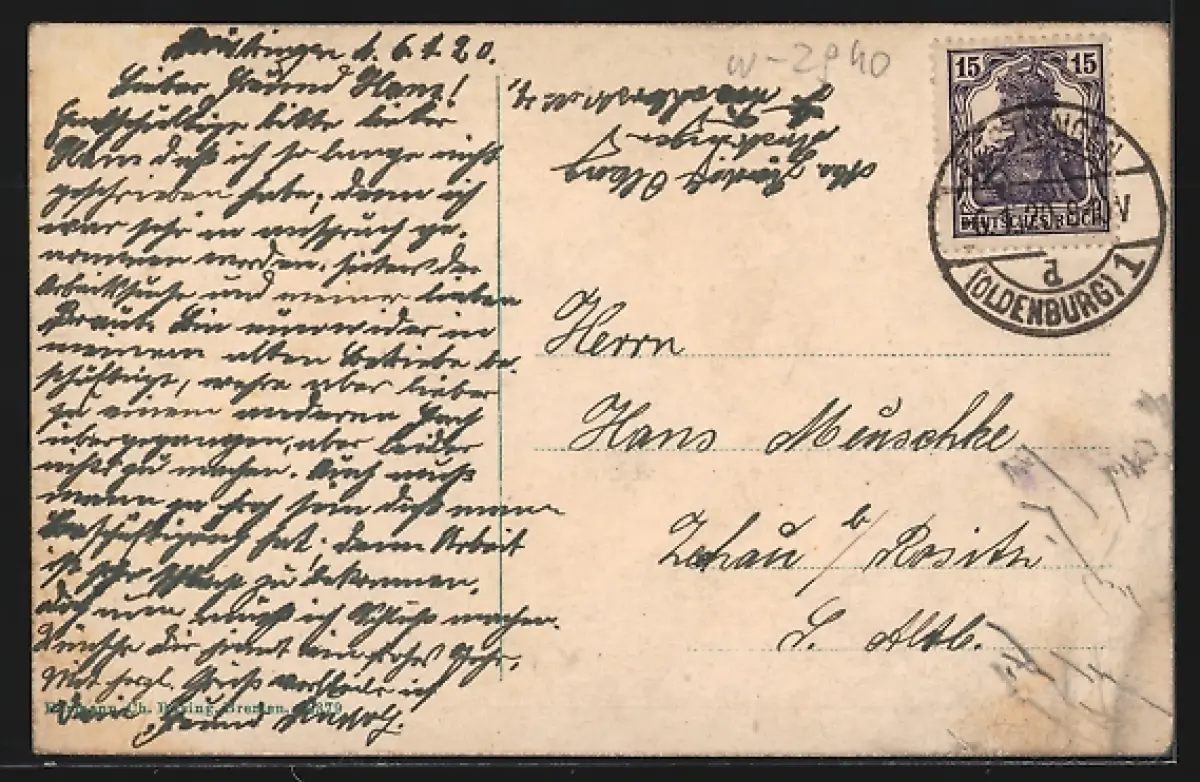 alte Ansichtskarte, gelaufen 1920, Stempelspur, Eckknicke li., guter Zustand