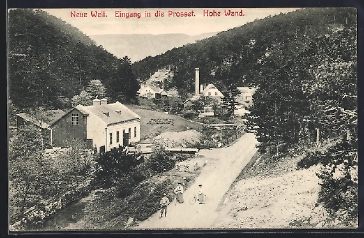 AK Winzendorf /Hohe Wand, Neue Welt, Eingang in die Prosset u. Radfahrer