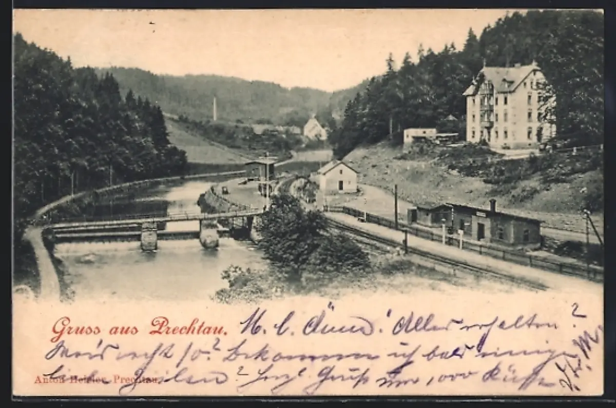 AK Wolkenstein /Erzgeb., Prechtau, Flossplatz mit Brücke und Gebäuden aus der Vogelschau, Panorama
