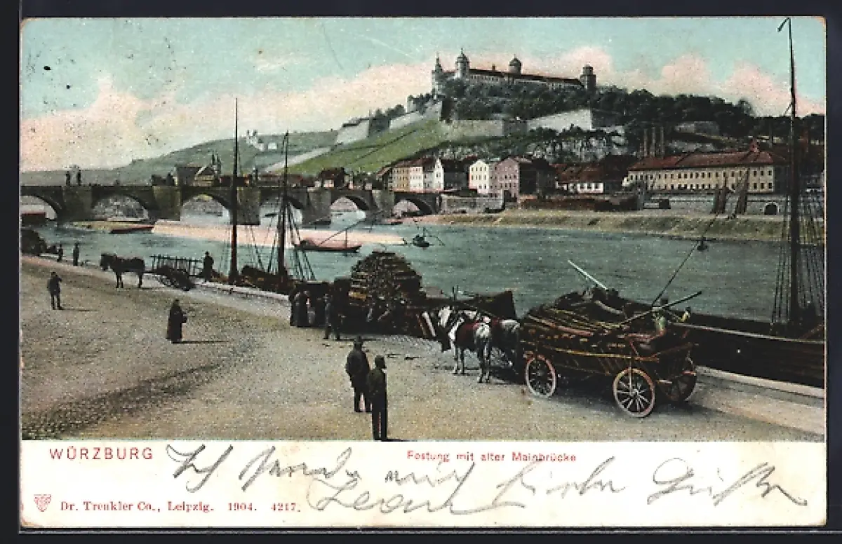 AK Würzburg, Festung mit alter Mainbrücke, Segelboote, Karren, Leute