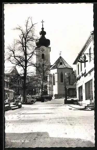 AK Ysper /N. Oe., Strassenpartie mit Gasthof und Kirche im Winter