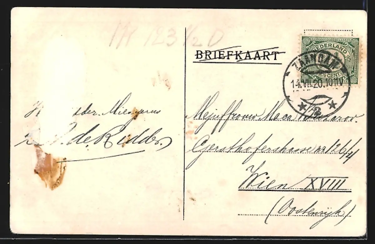 gelaufen 1920, rückseitig Klebe- und Papierreste, rückseitig Oberflächenschaden, guter Zustand