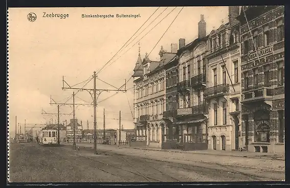 AK Zeebrugge, Blankenberghe Buitensingel, Strassenpartie mit Strassenbahn