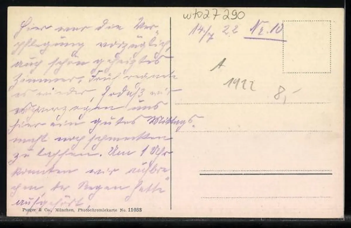 Personenbezogene Daten auf der Rückseite der Karte wurden durch blauen Textmarker unkenntlich gemacht. Die blauen Stellen sind auf die Vorderseite durchgeweicht und wirken sich negativ auf das Postkartenfoto aus