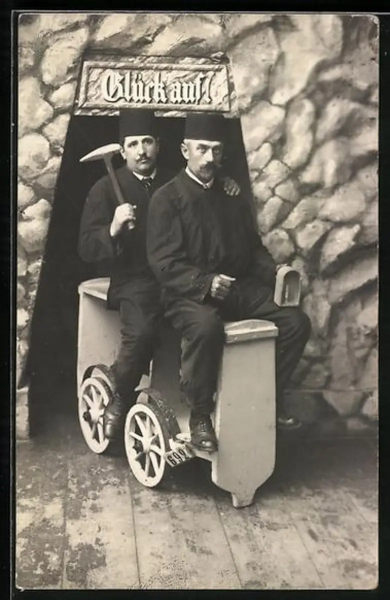 AK Zwei Bergarbeiter am Schachteingang, Bergbau