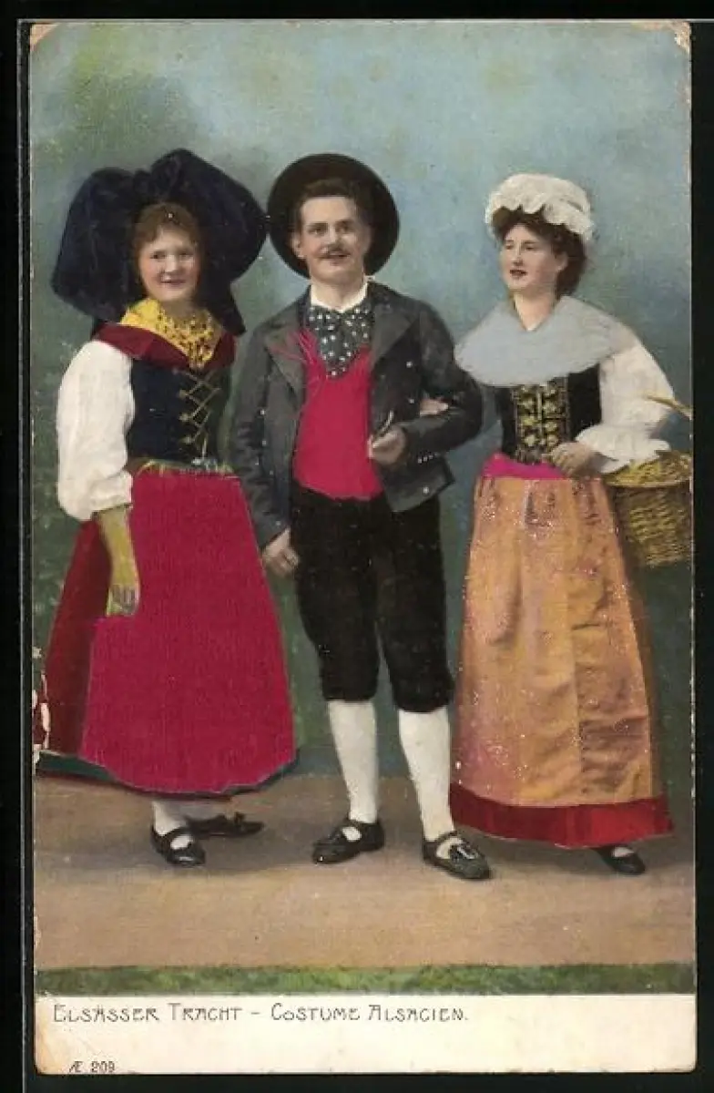 AK Zwei Damen mit Herr in der Mitte in Elsässer Tracht