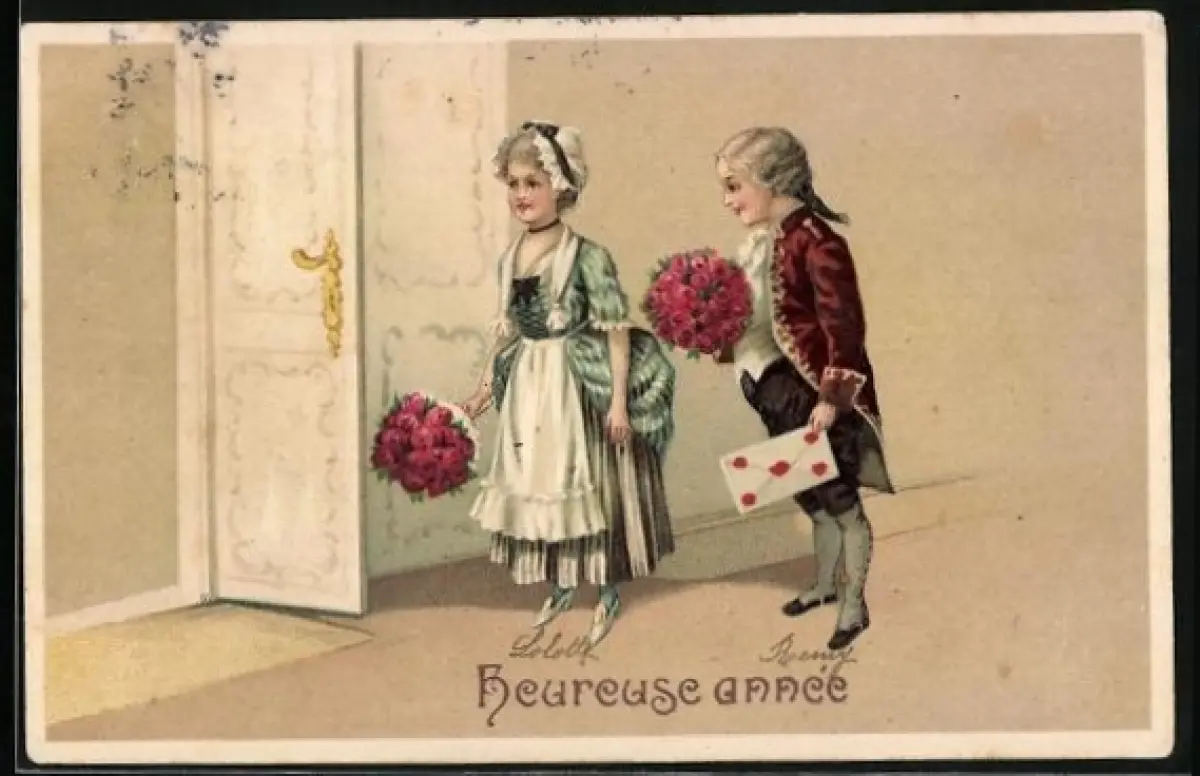 AK Zwei Kinder in Rococo Kleidung bringen Blumen zum Neujahr