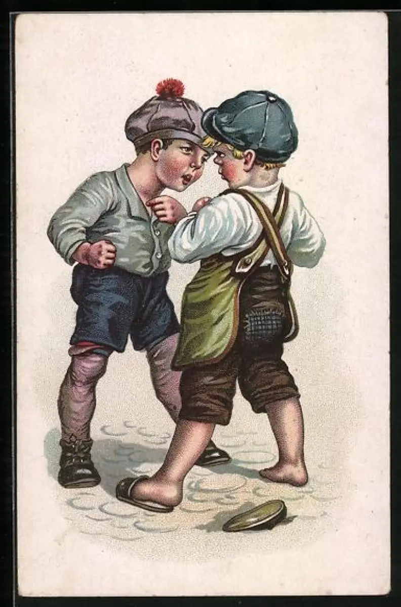 AK Zwei Knaben mit Schimmützen bei einem Disput
