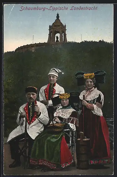AK Zwei Paare in Schaumburg-Lippischer Tracht vor Turm