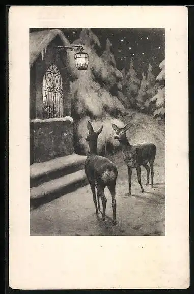 AK Zwei Rehe im Schnee vor einem beleuchteten Haus