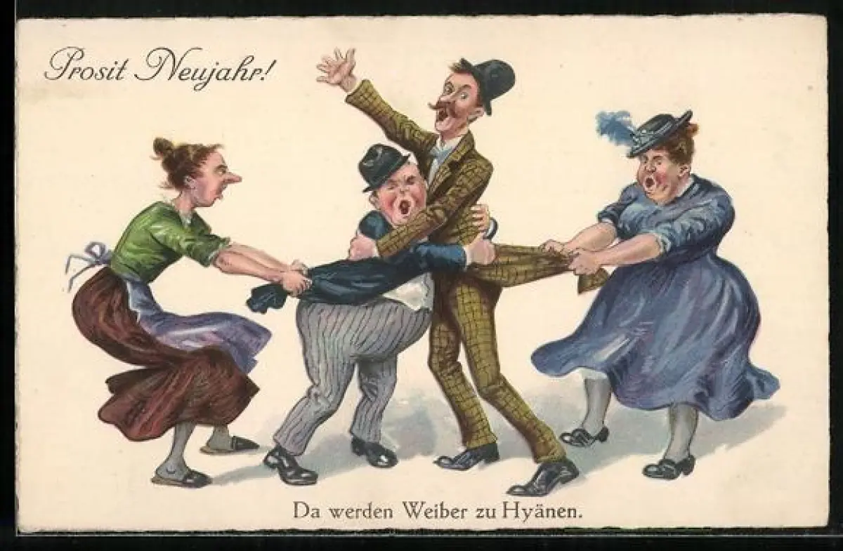 AK Zwei alte Jungfern kämpfen um zwei Kavaliere, Neujahrsgruss