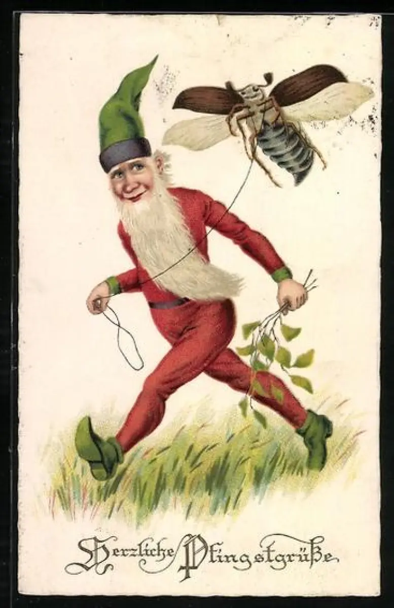 AK Zwerg mit Maikäfer an einer Leine, Pfingstgrüsse