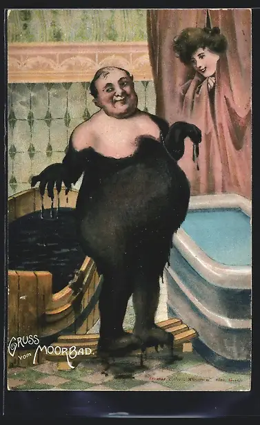 AK beleibter Mann nach dem Moorbad wird von der Frau beobachtet