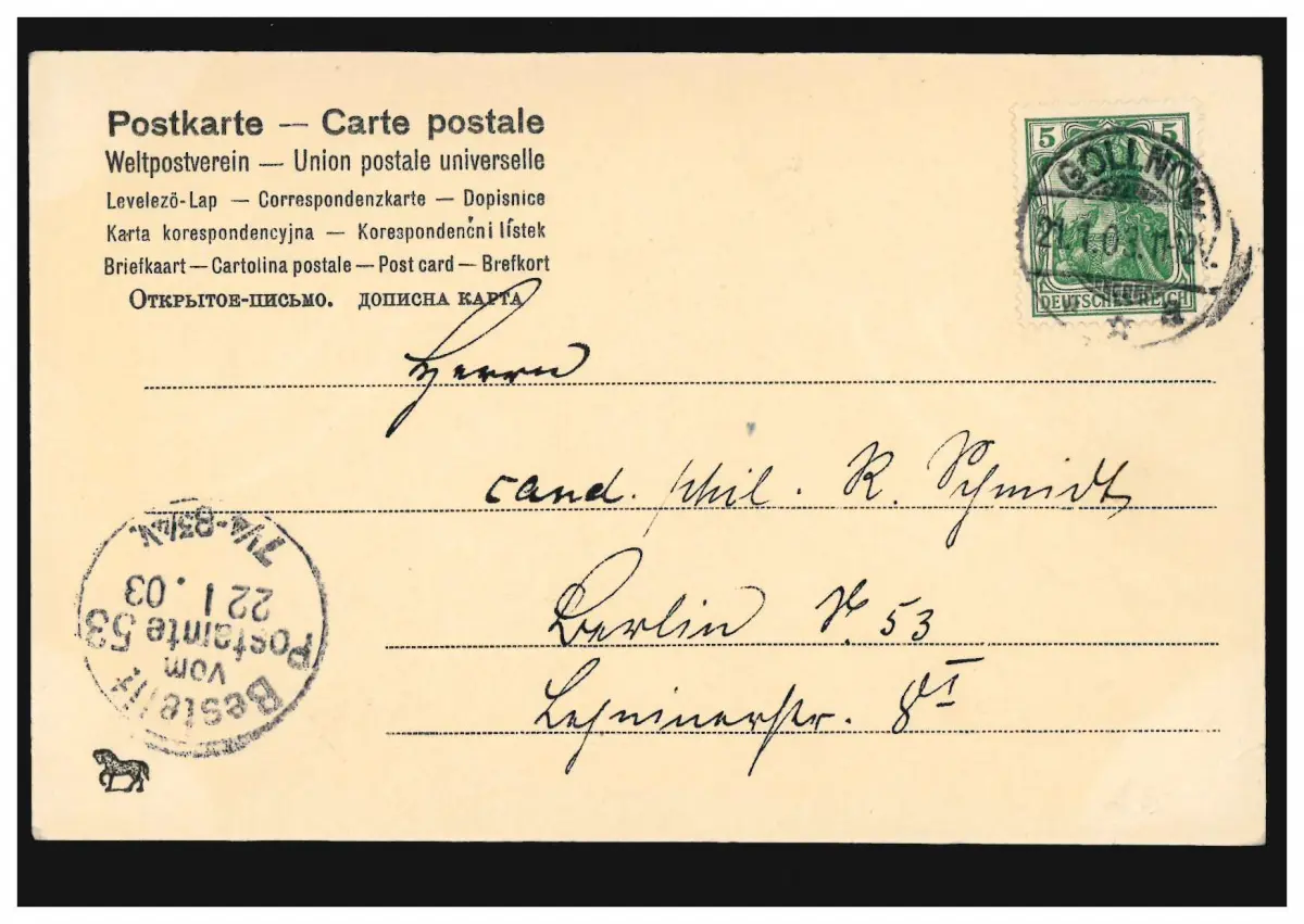 Ankunftsstempel "Bestellt vom Postamte 53 - 22.1.03"