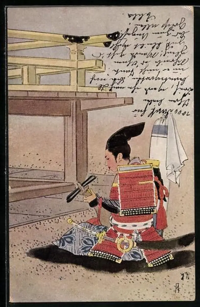 AK ein Samurai kniet vor einem Tempelschrein nieder