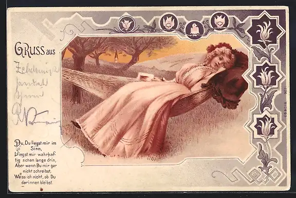 AK junge Frau träumend in der Hängematte liegend, Jugendstil