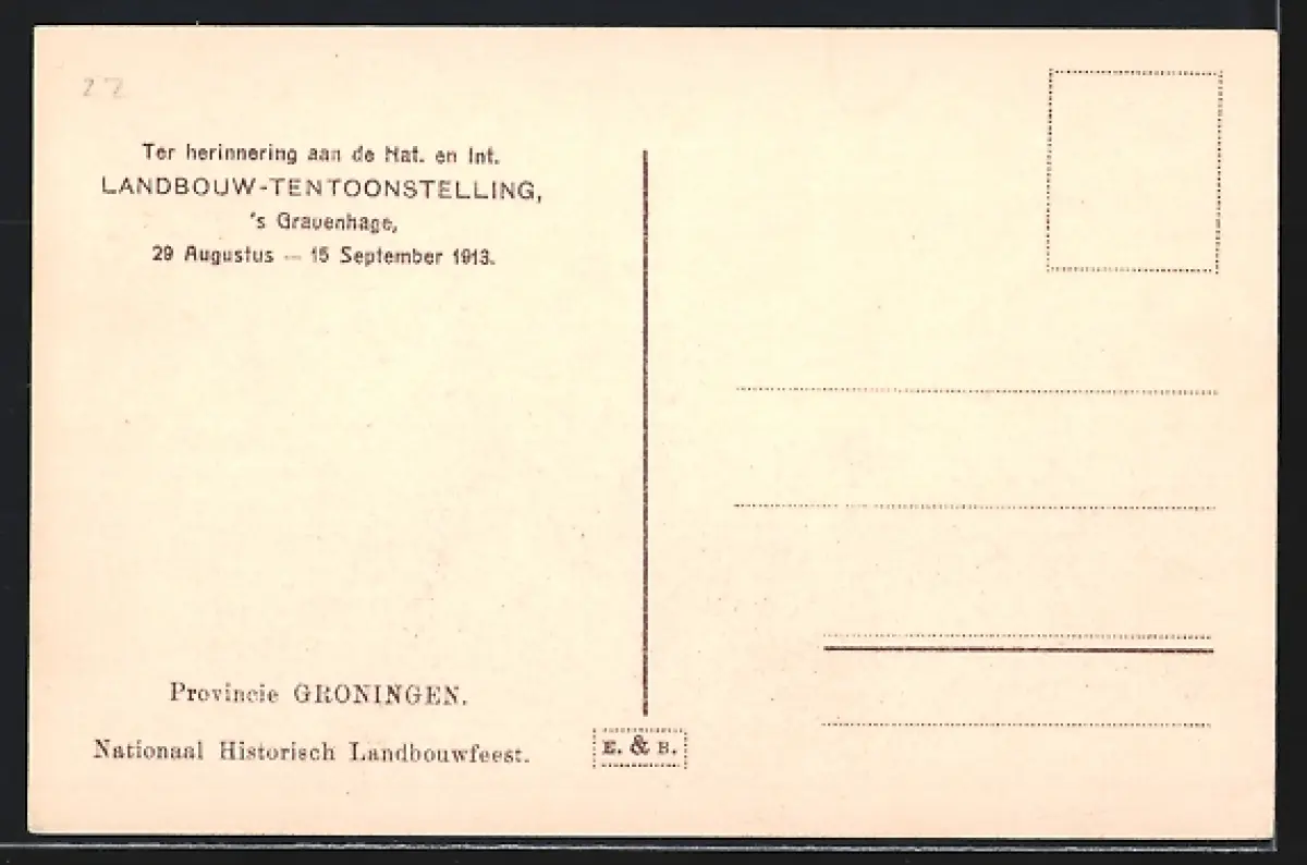 AK `s Gravenhage, Nat. en Int. Landbouw-Tentoonstelling 1913, Provincie Groningen, Nationaal Historisch Landbouwfeest