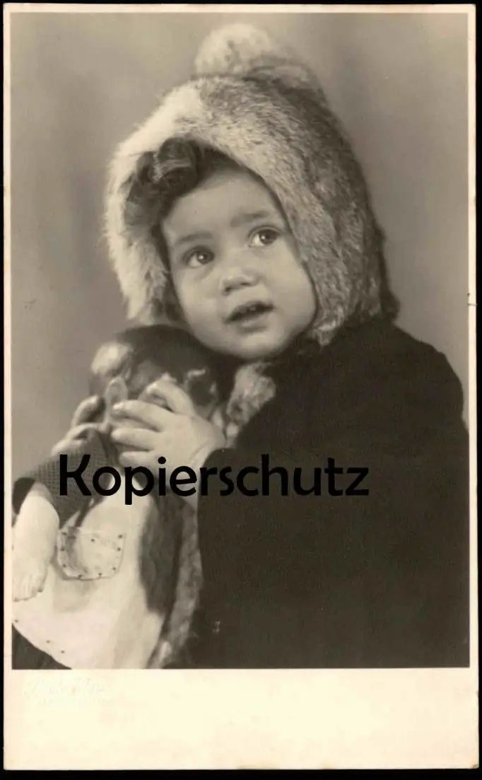 ALTE FOTO POSTKARTE KIND MIT PELZ UND SPIELZEUG-PUPPE
