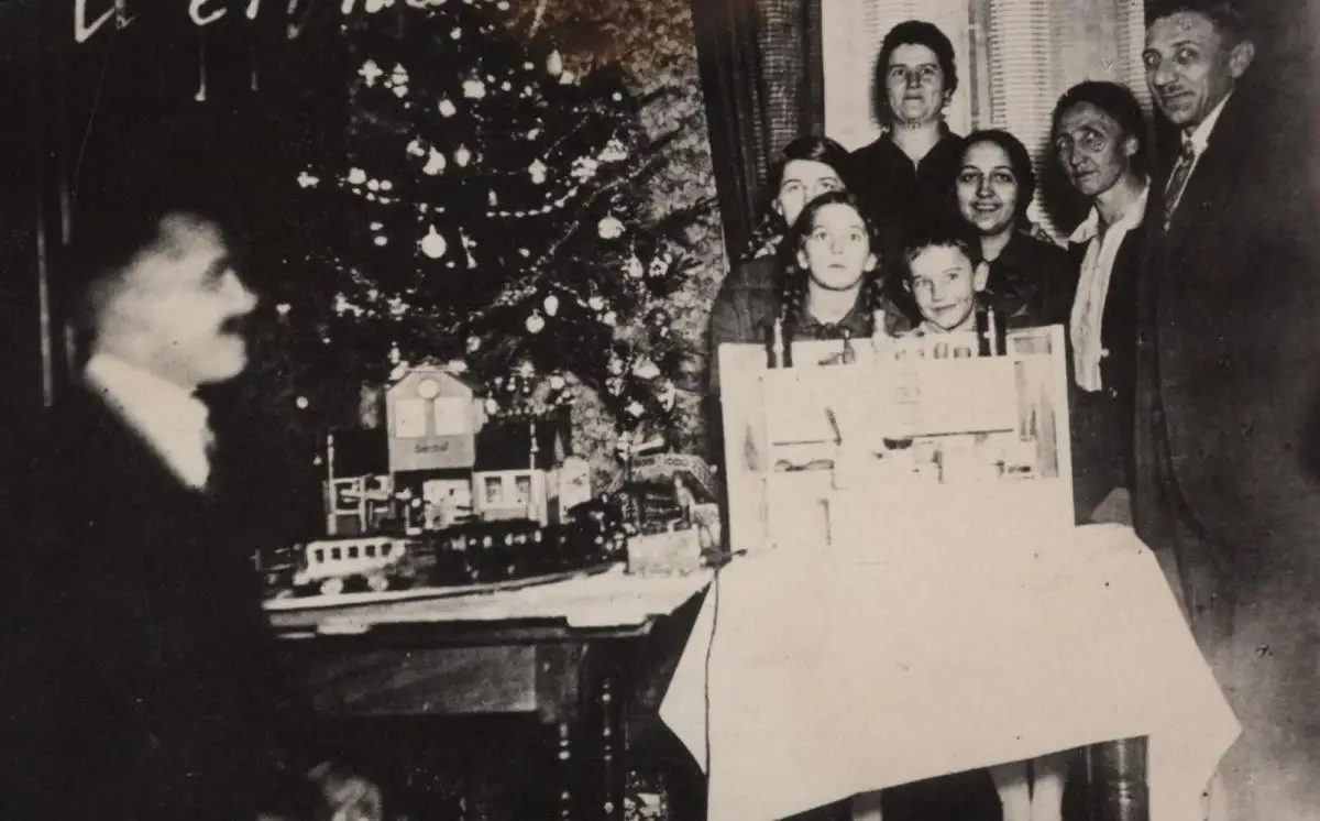 ALTE FOTO POSTKARTE WEIHNACHTEN 1929 CHRISTBAUM MODELLEISENBAHN ZUG MÄRKLIN ? train Blechspielzeug photo postcard AK cpa