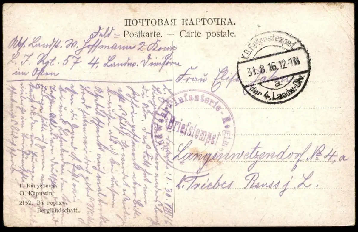 Gelaufen: 31.08.1916 mit Feldpoststempel Feldpostexpedition der 4. Landwehr-Division sowie Briefstempel Landwehr-Infanterie-Regiment nach Langenwetzendorf