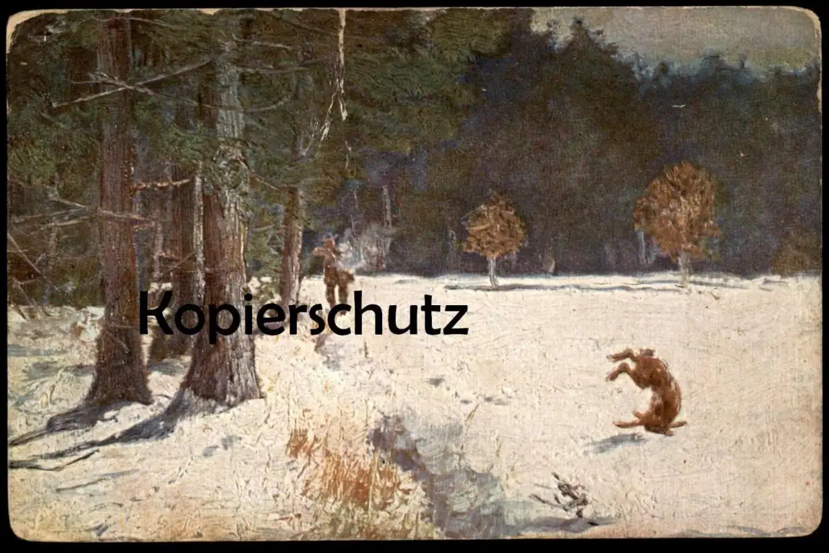 ALTE KÜNSTLER POSTKARTE JAGD IM SCHNEE HASE JÄGER hunting chasse chase chasseur hunter Gewehr Wild cpa postcard AK